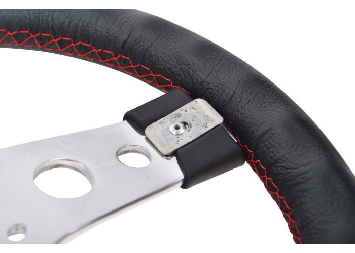 The classic looking 13″ steering wheel from the 1960s and 70s with round holes in the 3 semi dished polished alloy spokes and a leather rim with red stitching.